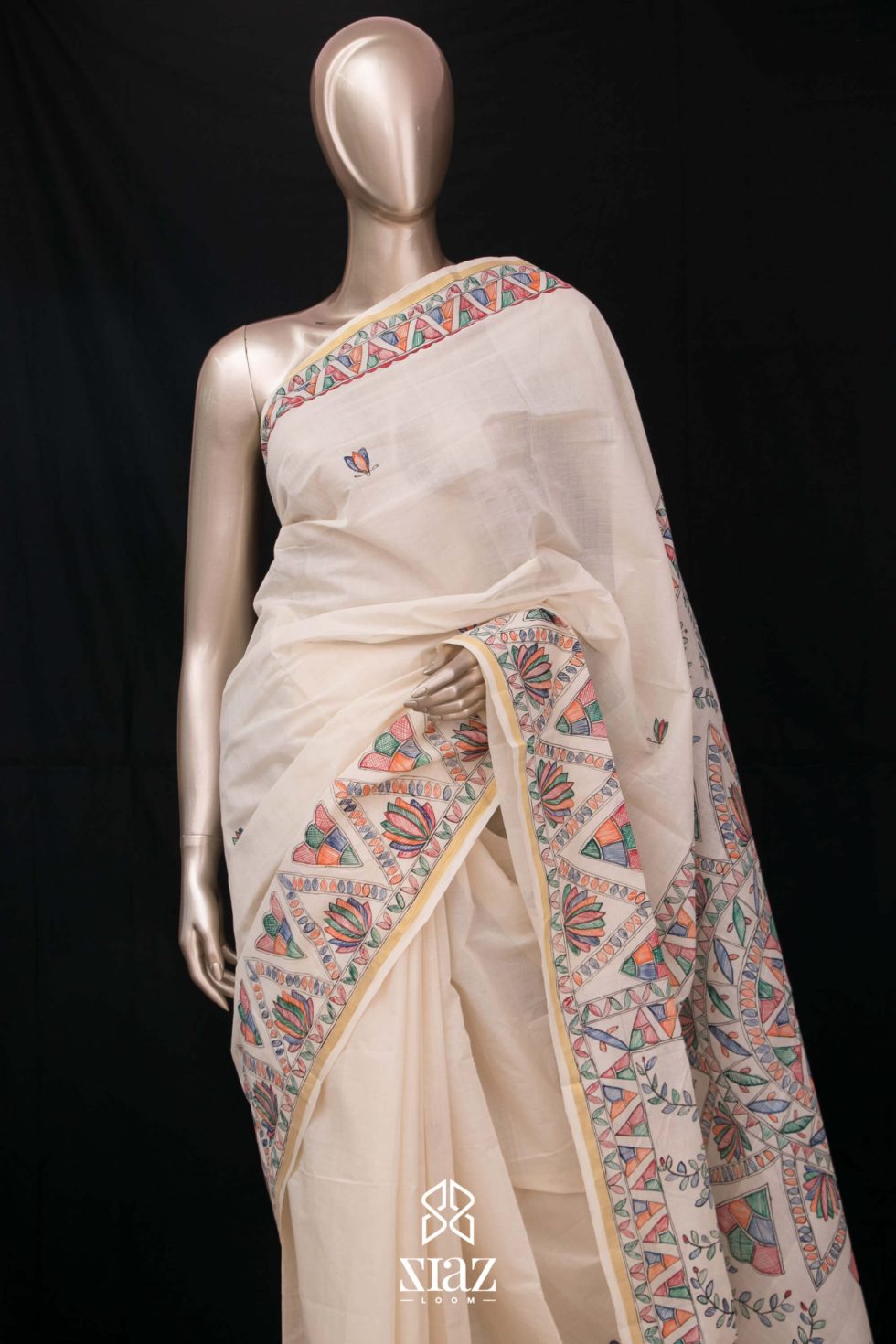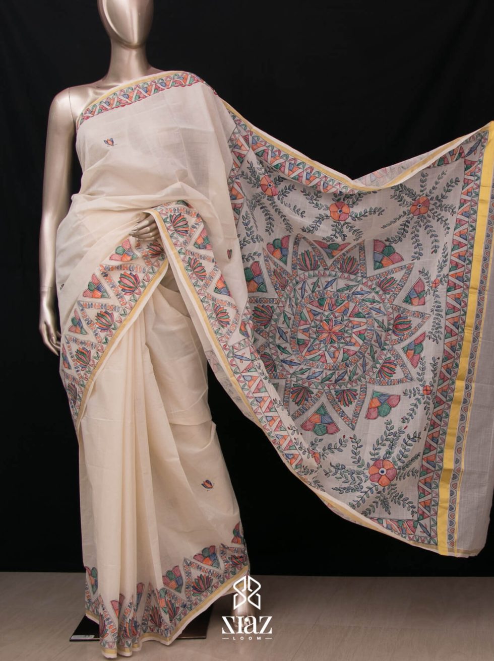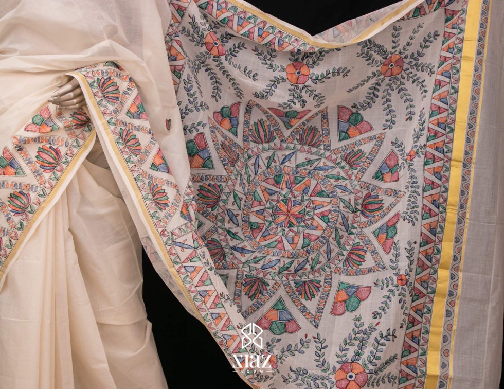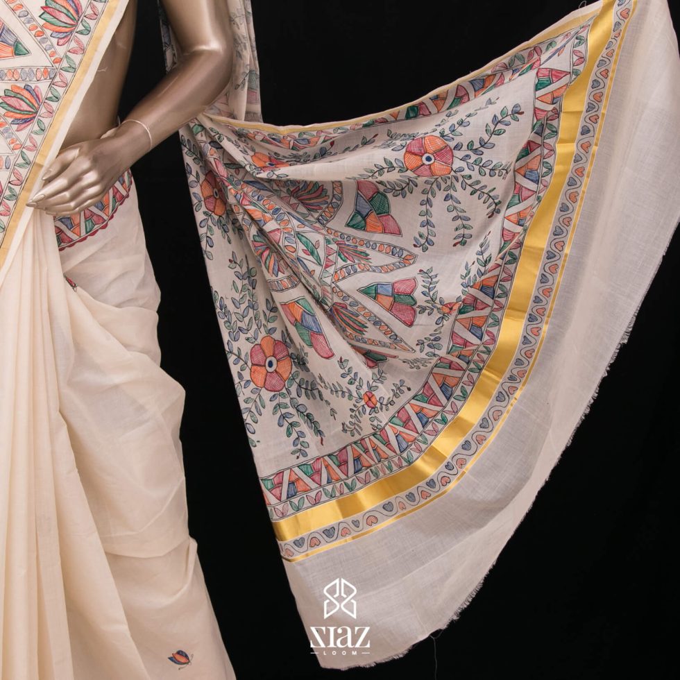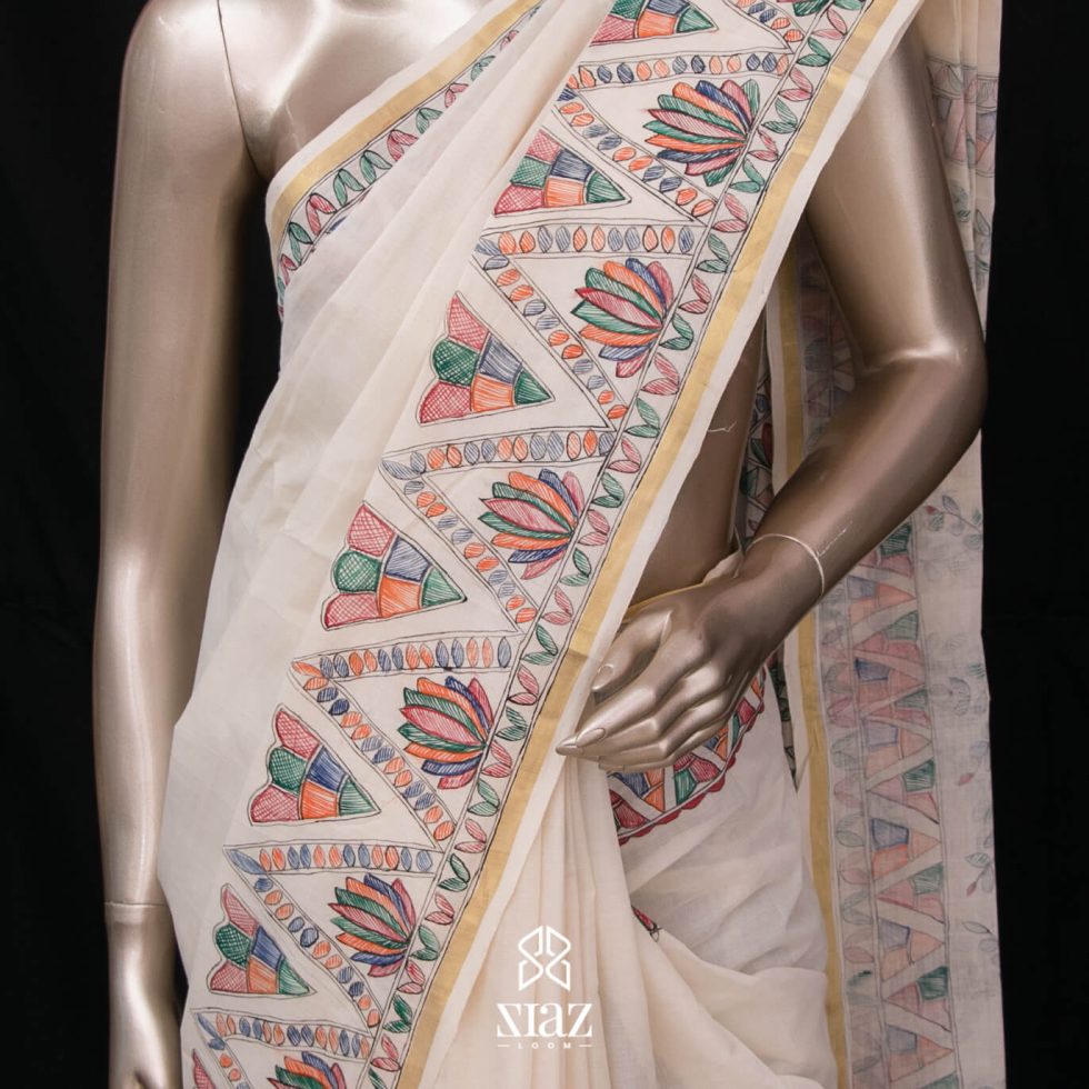 SIAZ LOOM – Handloom Kerala Saree with Madhubani Art Hand Paintings – Golden Zari Border (Kara)