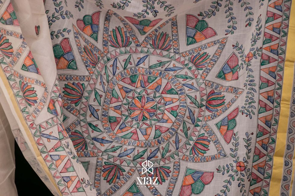 • Madhubani Art Hand Painting along the Borders of saree