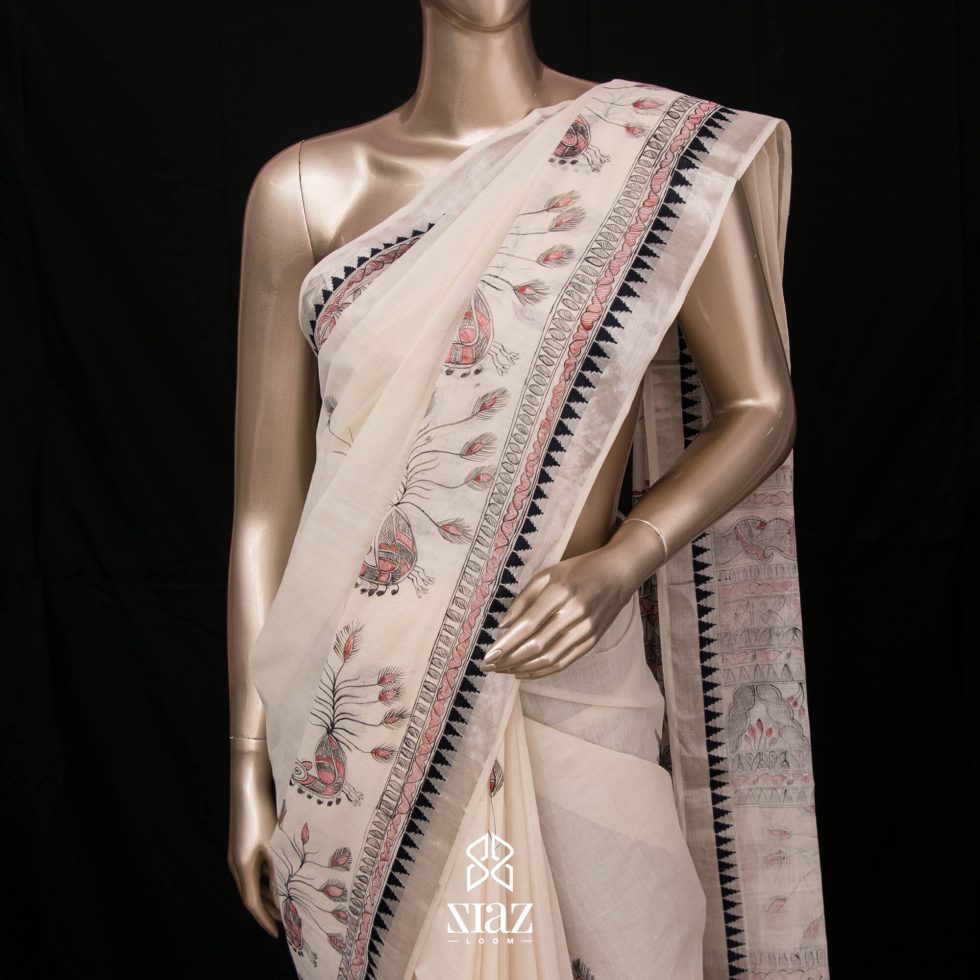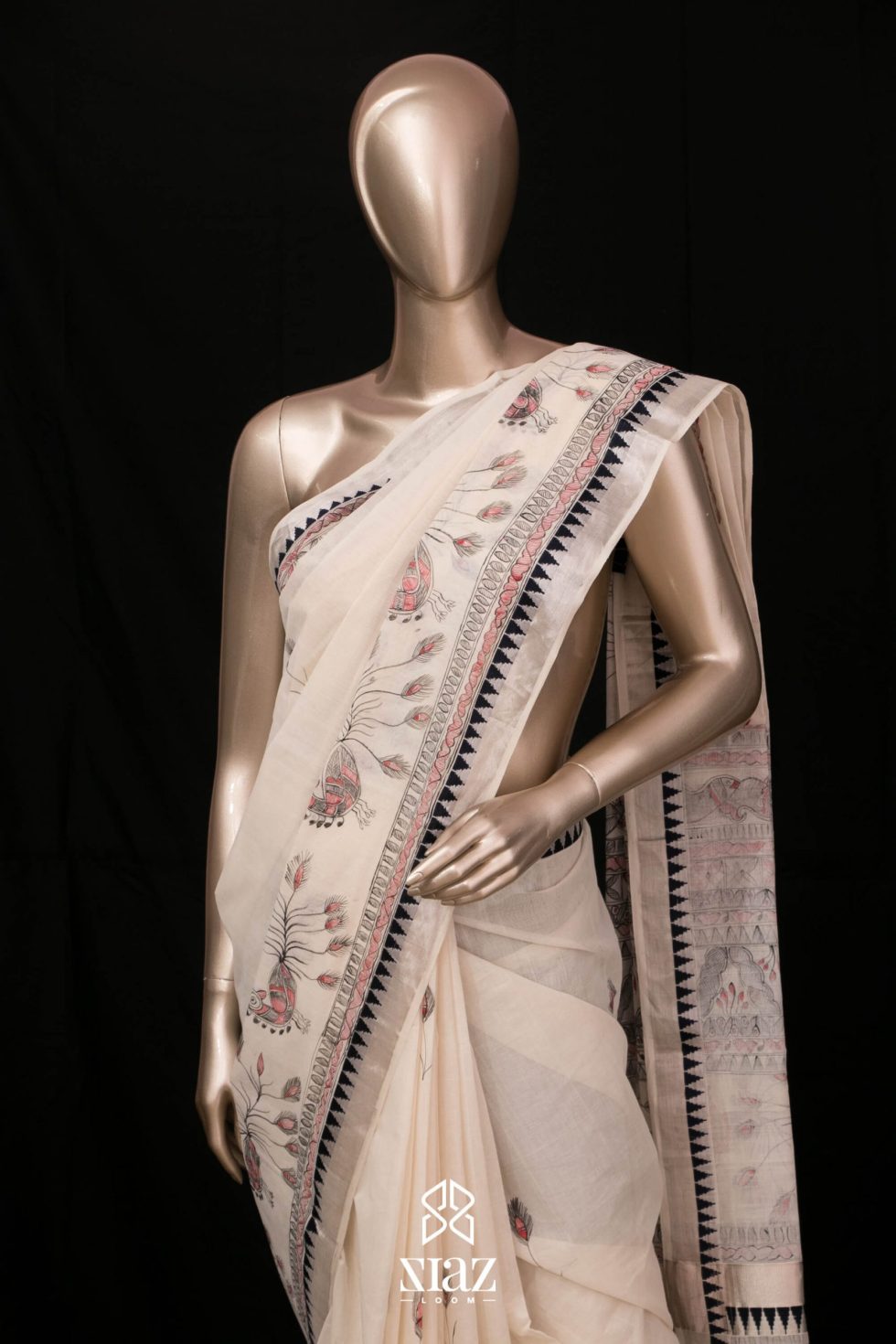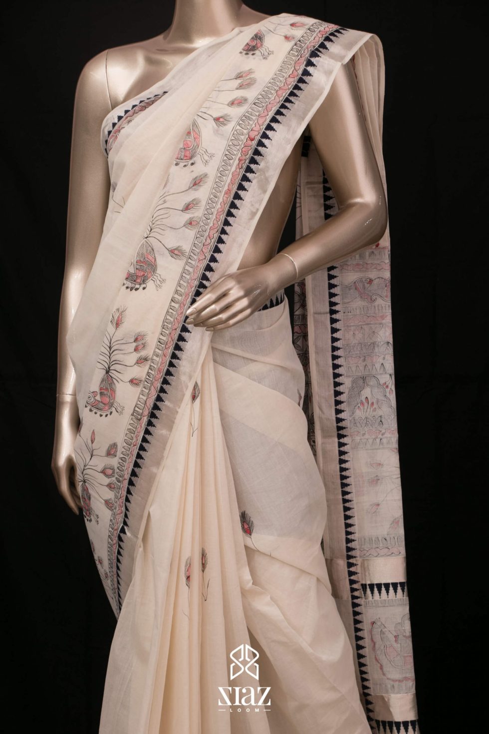 SIAZ LOOM – Handloom Kerala Saree with Madhubani Art Hand Paintings – Silver Zari Border (Kara) with black temple design