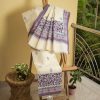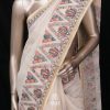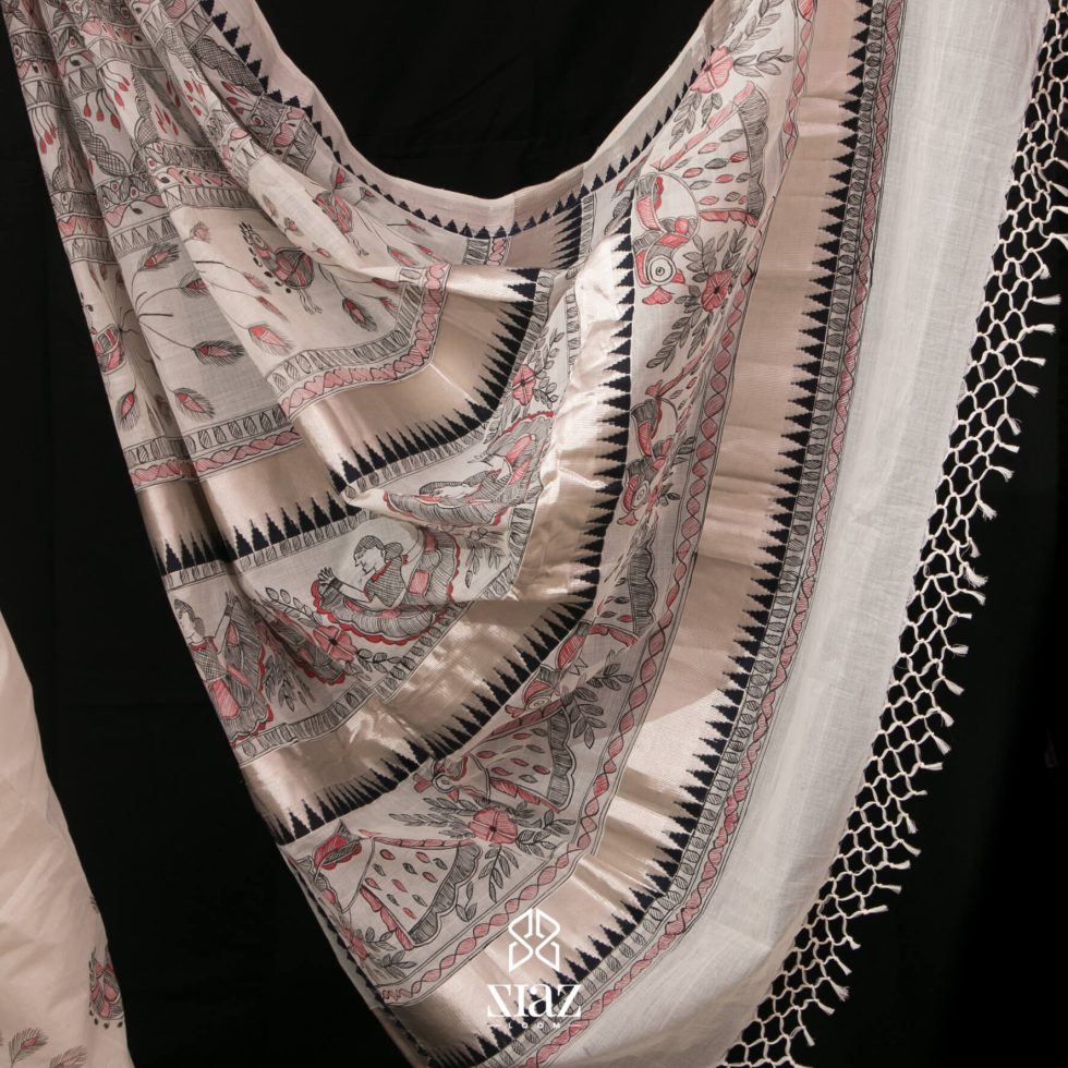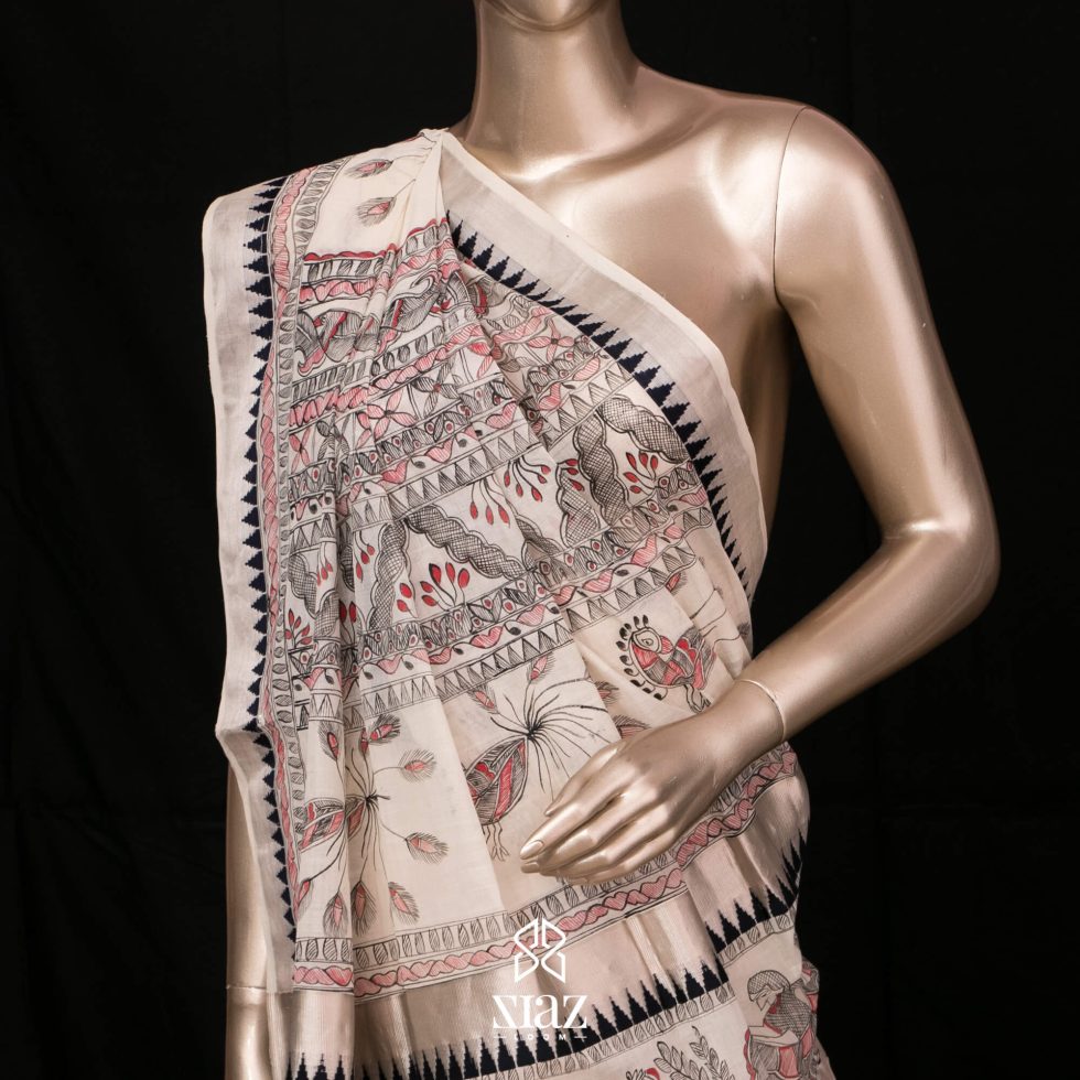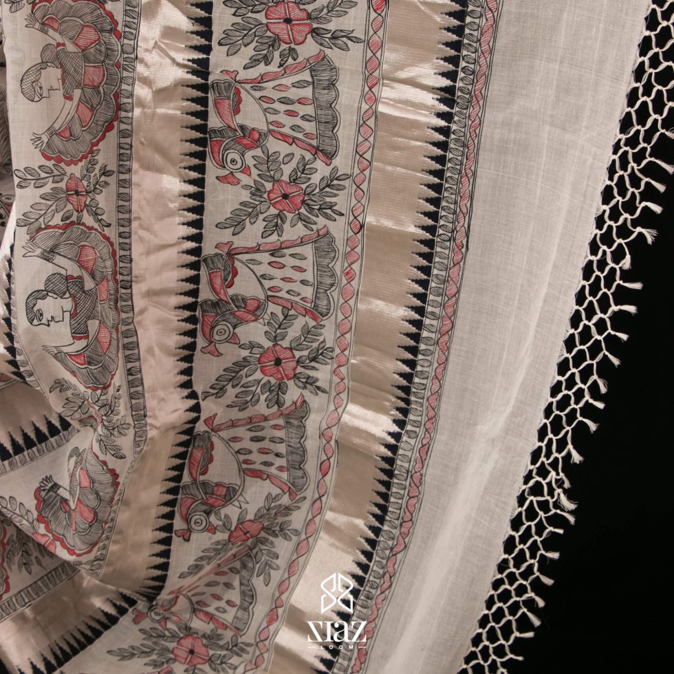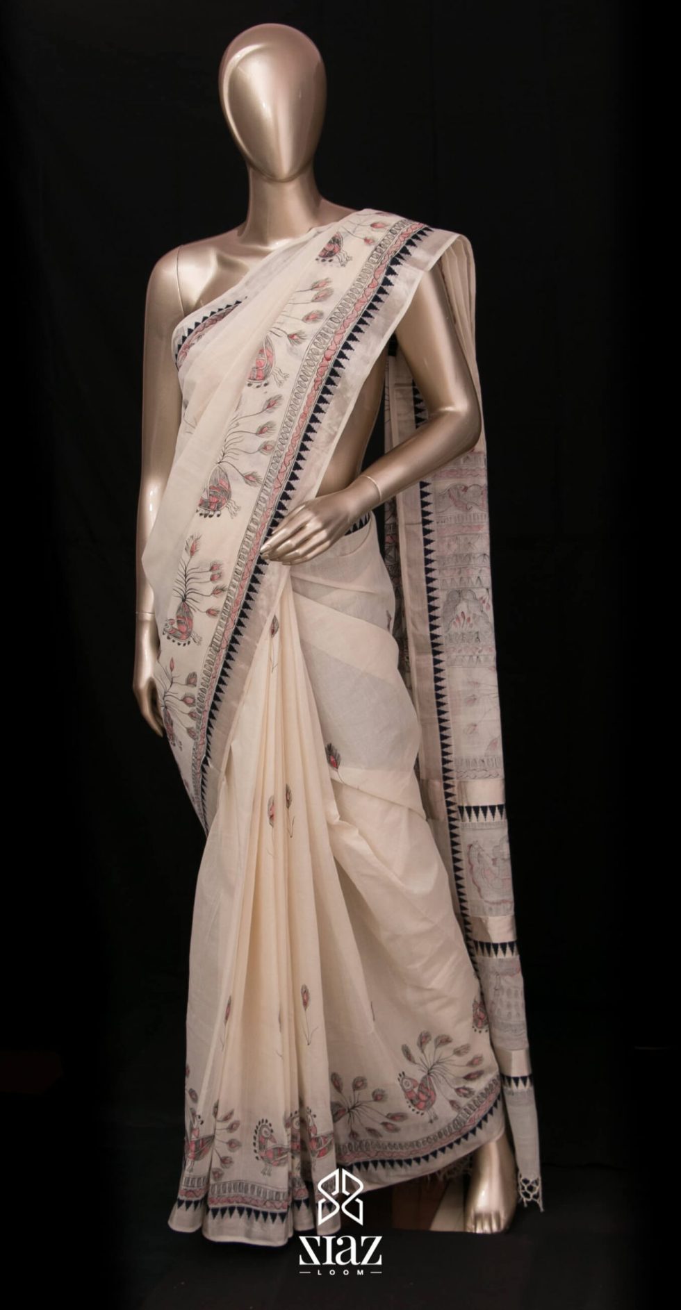 SIAZ LOOM – Handloom Kerala Saree with Madhubani Art Hand Paintings – Silver Zari Border (Kara) with black temple design