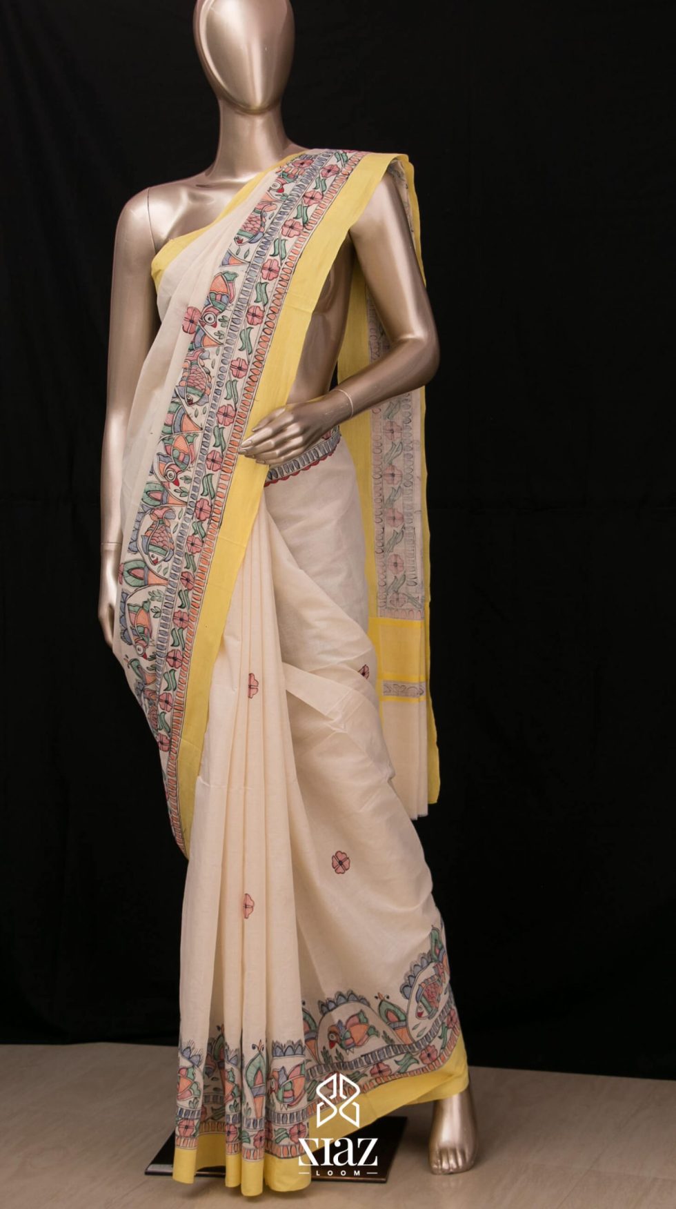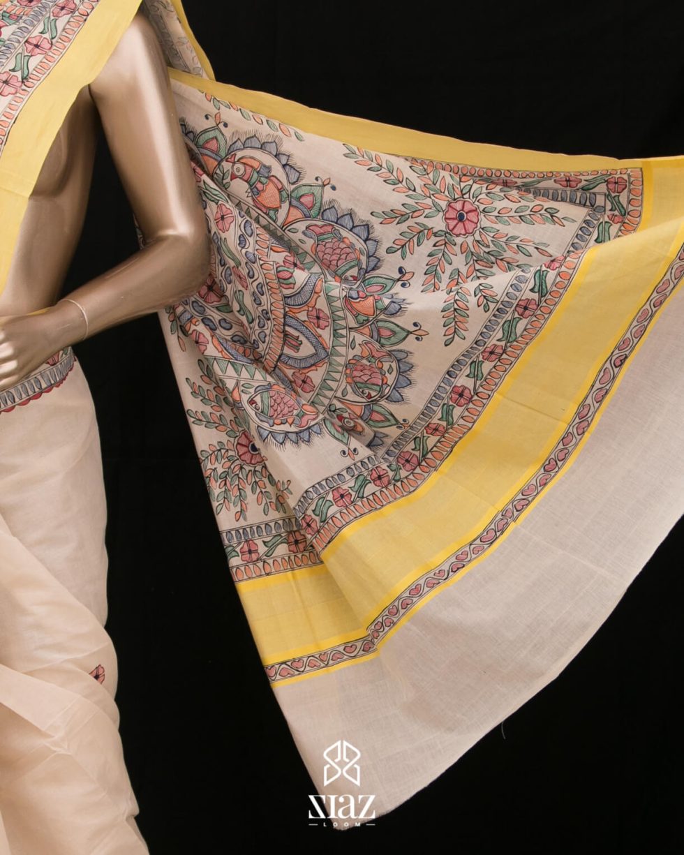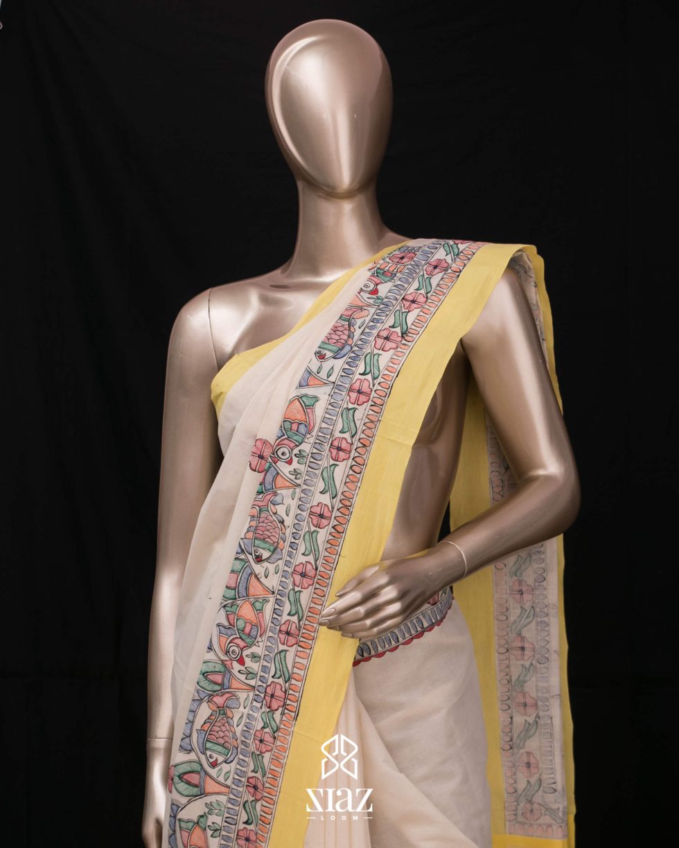 SIAZ LOOM – Handloom Kerala Saree with Madhubani Art Hand Paintings – Yellow Border (Kara)