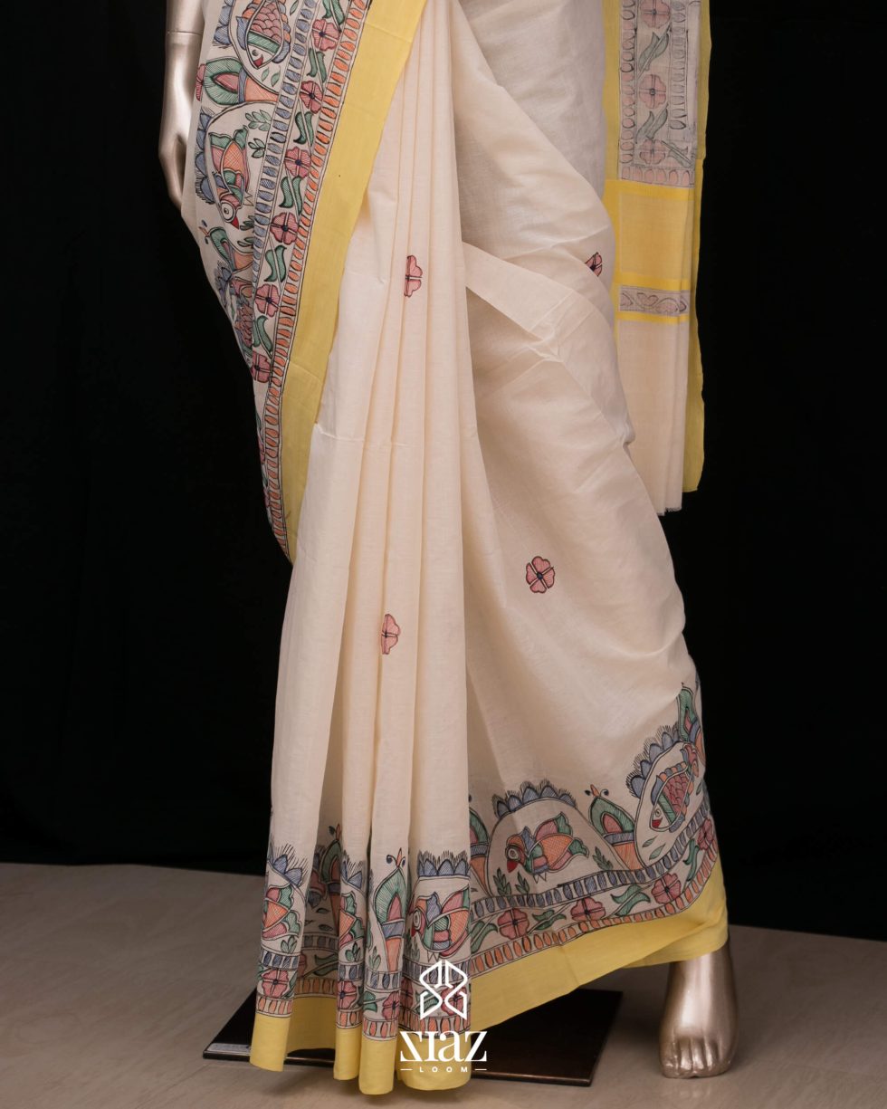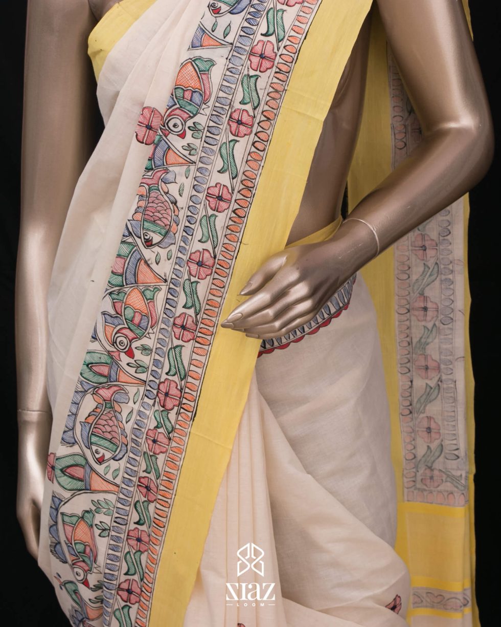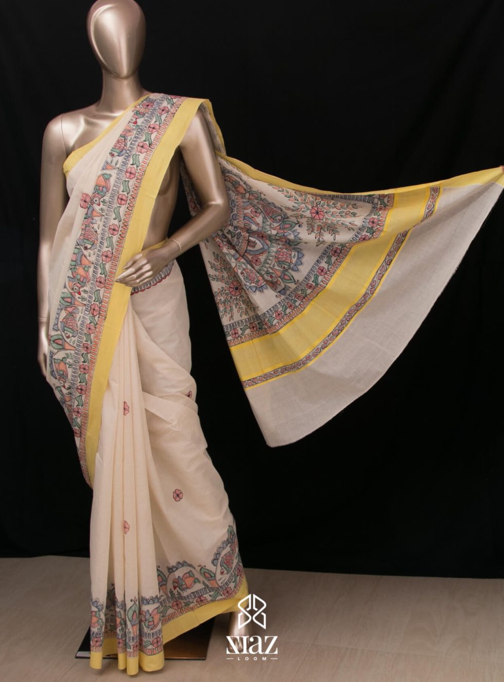 SIAZ LOOM – Handloom Kerala Saree with Madhubani Art Hand Paintings – Yellow Border (Kara)
