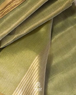 The saree is in a moss green shade with a subtle sheen, enhanced by a golden zari border. The fabric appears to have golden undertones, giving it a luxurious and sophisticated look.This exquisite handwoven silk saree in moss green is a perfect blend of tradition and elegance. The body features a fine golden striped texture, adding a rich, lustrous appeal. The golden zari border complements the overall design, enhancing its regal charm.The pallu is adorned with delicate golden weaves, creating a graceful drape that reflects light beautifully. The lightweight fabric allows for a smooth, effortless fall, making it ideal for special occasions.Paired with antique silver or gold jewelry, this saree is perfect for weddings, festivities, or evening gatherings. Style it with a matching or contrasting blouse in beige, gold, or dark green to complete the look.