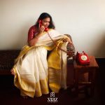 • Kerala saree with temple zari border and zari stripes on Pallu