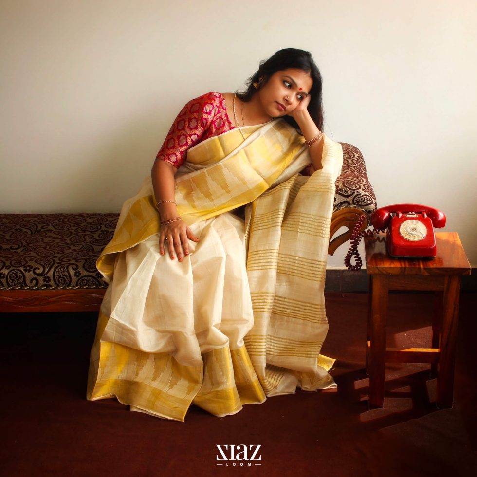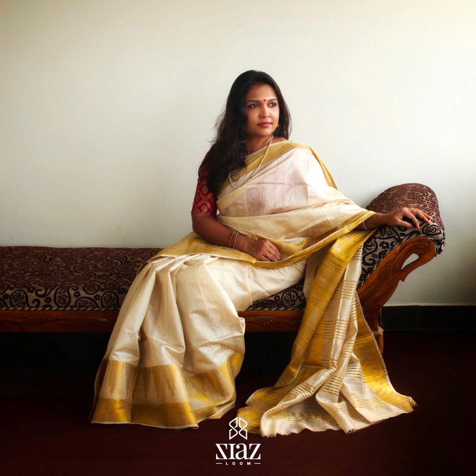 Siazloom Pure Handloom Kerala Saree in MULBERRY SILK Thread with Temple Zari Design Border and Zari striped Pallu