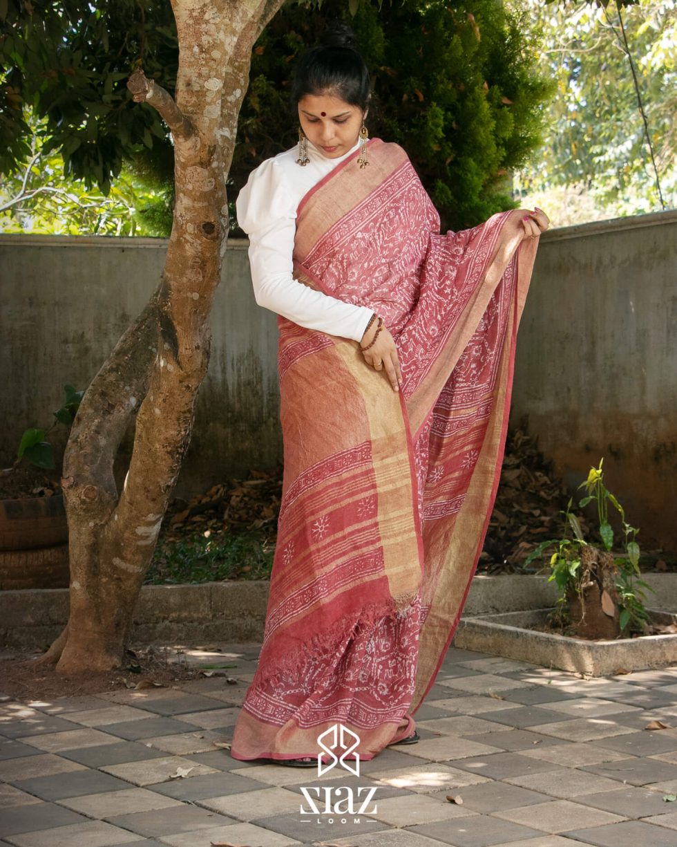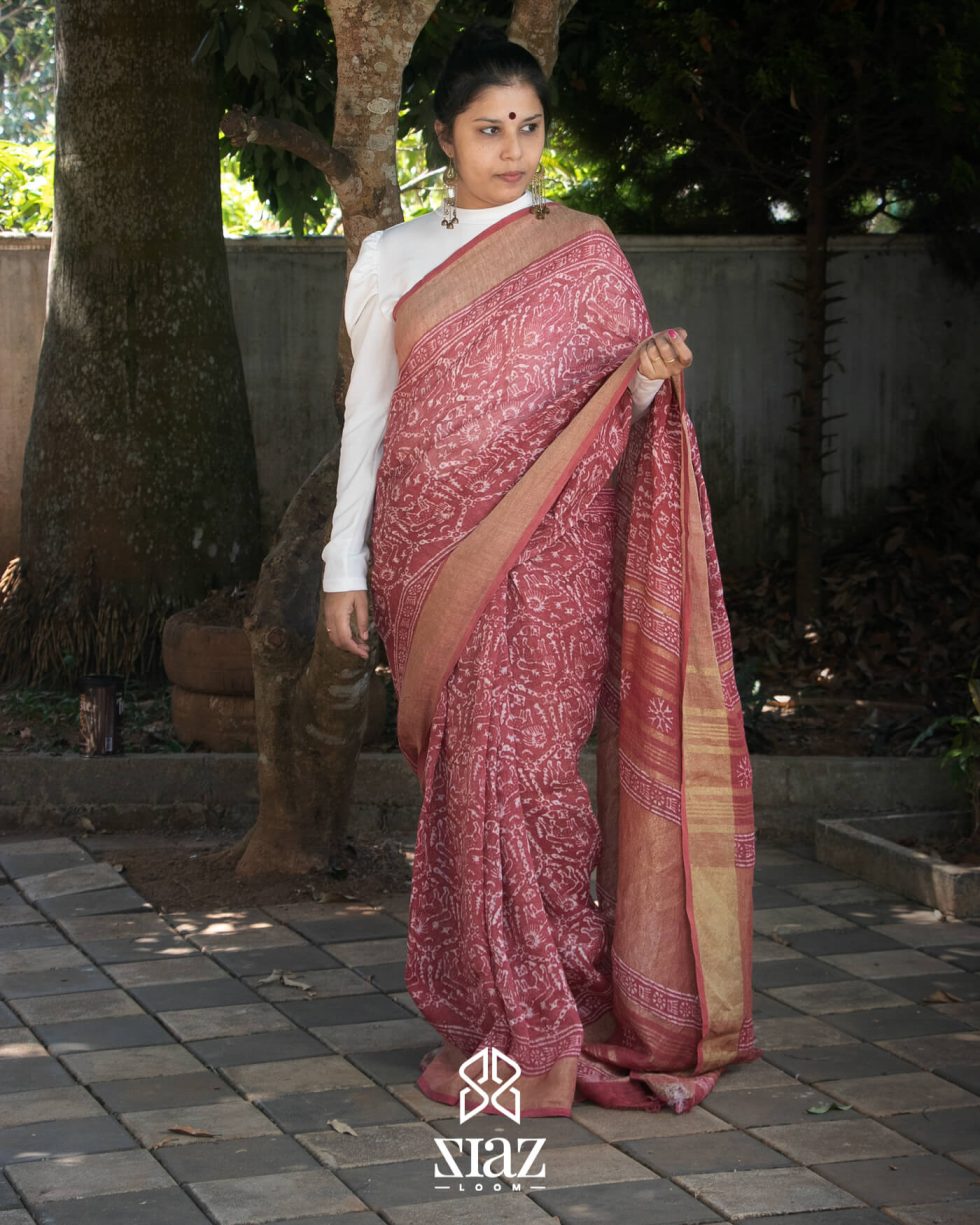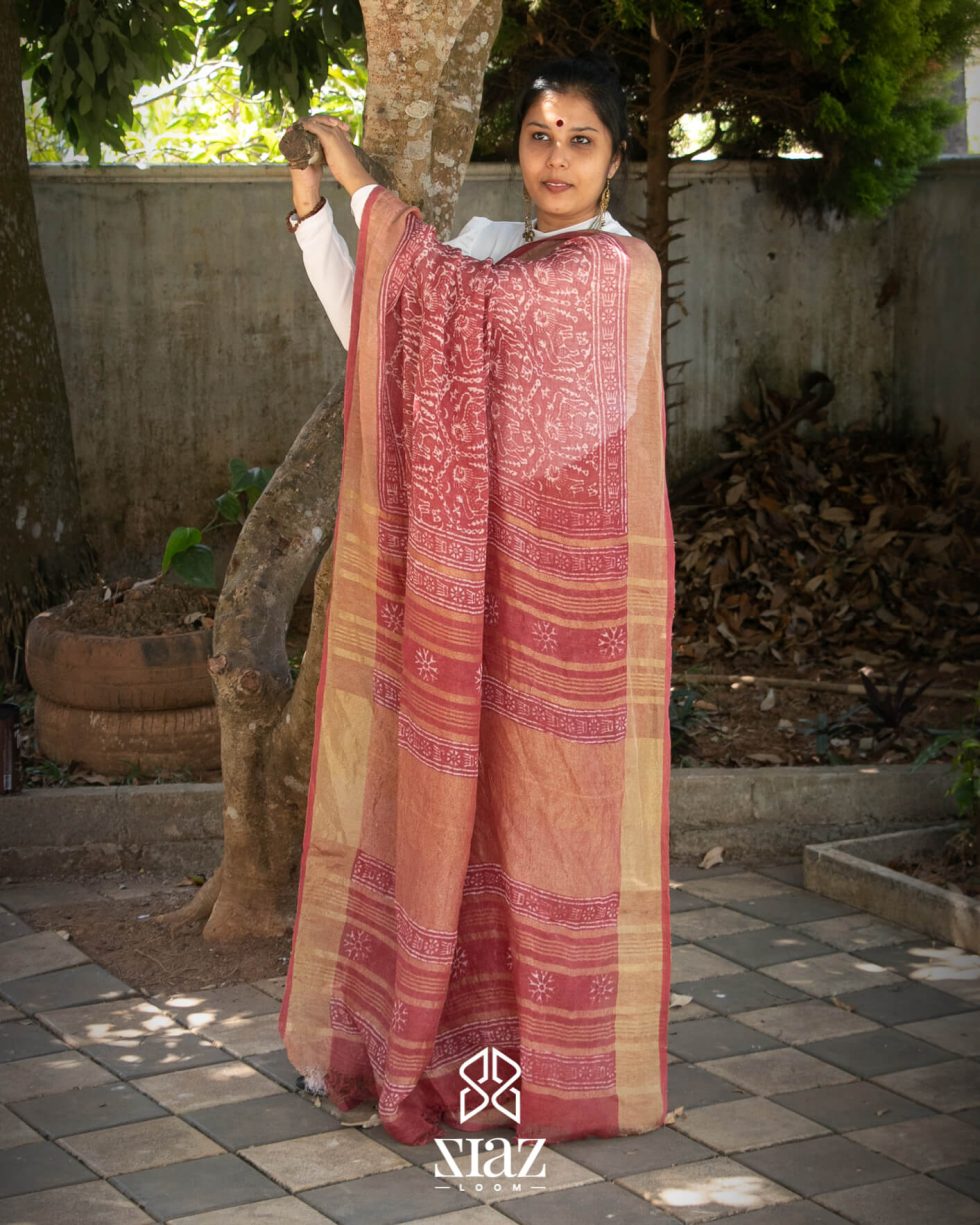 Siazloom Red coloured Handloom Linen Saree with Batik Work and Golden Zari on Pallu