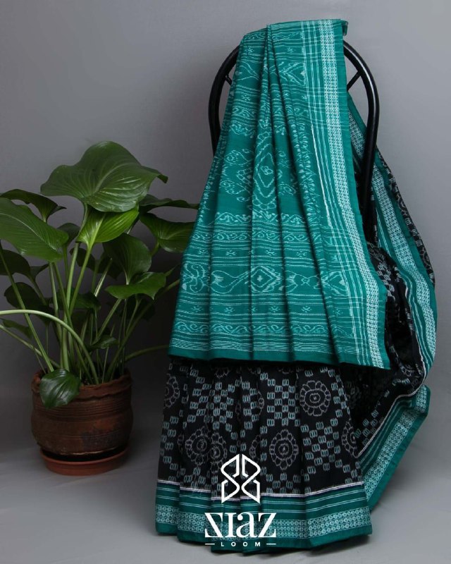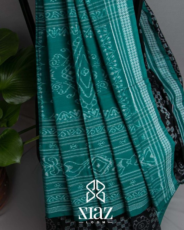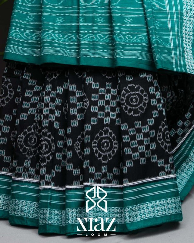Siazloom SAMBALPURI HANDLOOM COTTON Black Saree with White Pattern, Turquoise Green Pallu and similar Border